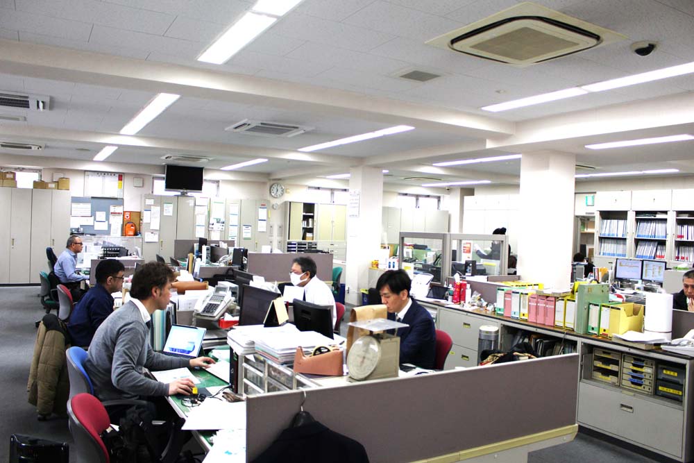 窓から光が入り、開放感にあふれた執務スペースです。メンバー同士の顔が見えやすく、スムーズに連携を図る。働きやすさを重視した、清潔感のあるオフィスです。